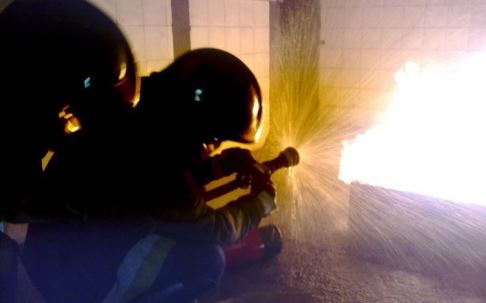 Prácticas sobre fuego real en interiores, con presión de agua y rescate de víctima.